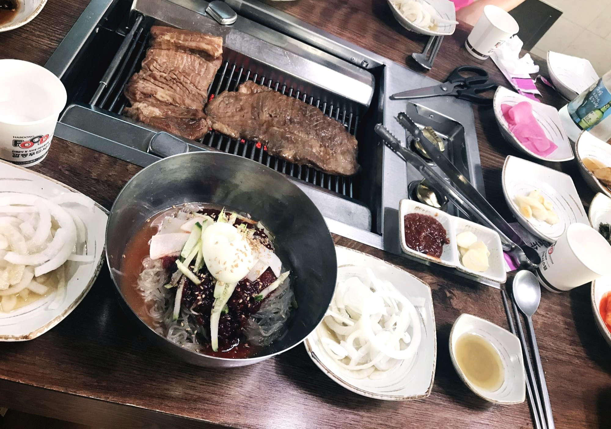 저희는 총 5인가족(아기 포함)이었고, 주문한 메뉴는 돼지왕갈비 2인분, 갈비탕 하나, 비빔냉면 하나, 그리고 공깃밥과 막걸리였답니다. 각자 취향이 반영된 메뉴 주문이었지요..ㅋㅋ