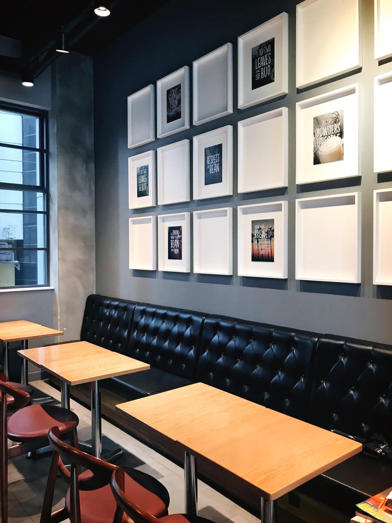 사진에서 보듯이 2층과 3층 공간이 있는데, 각기 다른 인테리어로 꾸며져 있는 것을 보실 수 있어요. 특히 3층 공간은 단체석과 같이 'ㄴ'자 타입의 소파석이 이루어져있고, 벽면도 라이트 블루톤으로 새삼 다른 모습이었답니다. 개인적인 생각으로는 전혀 커피빈스러운 인테리어는 아니었어요.