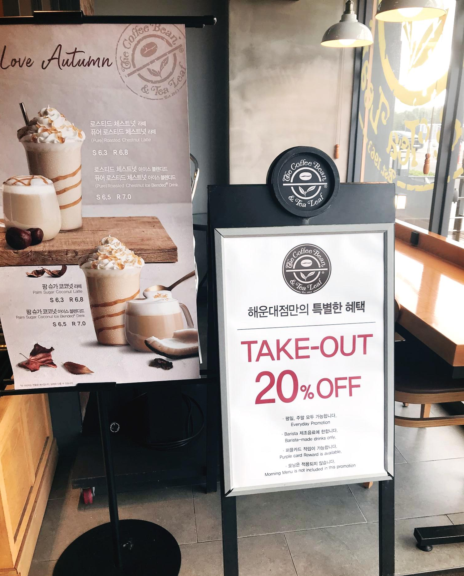 들어갈 때는 미처 발견하지 못했는데, 가게를 나오며 보니 테이크아웃은 20%를 할인해 주고 있었어요. 그래서 비바람으로 바깥 나들이가 어려울 것 같아 호텔에서 마실 겸 아이스 아메리카노를 테이크아웃하여 가지고 왔답니다. 괜시리 현명한 소비를 한 것 같은 생각이 들게 하였어요.